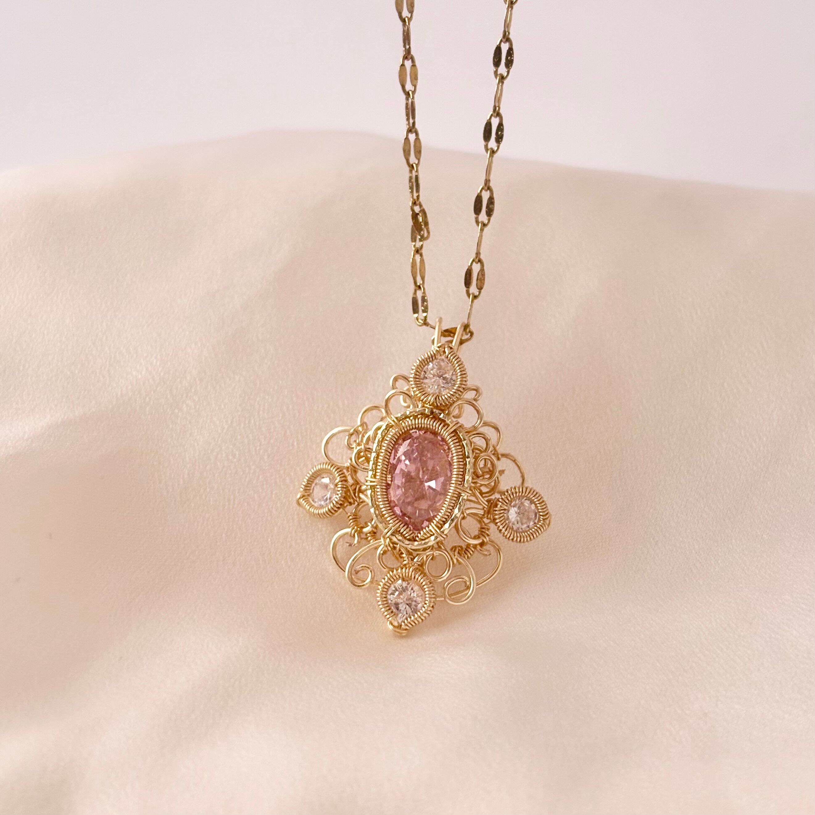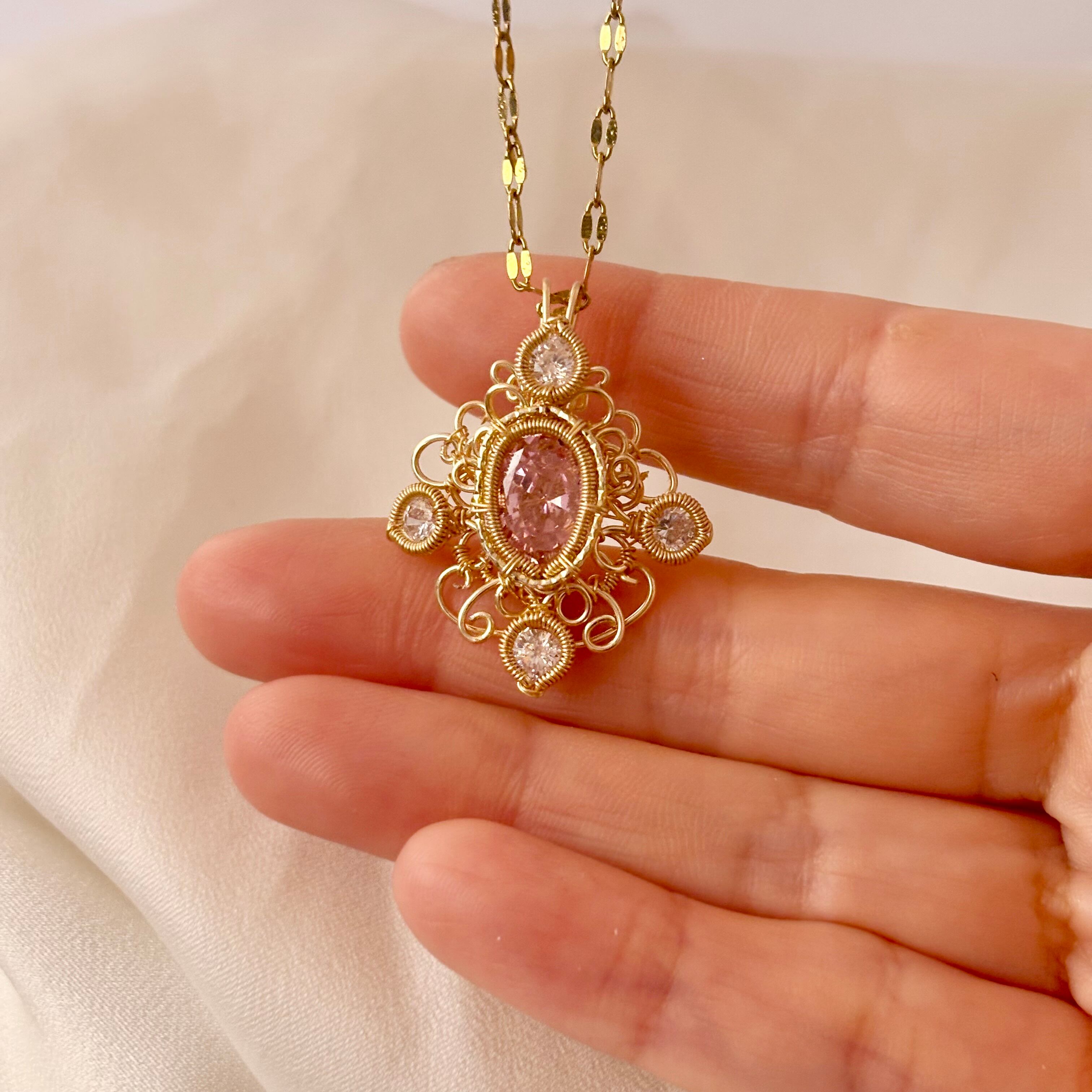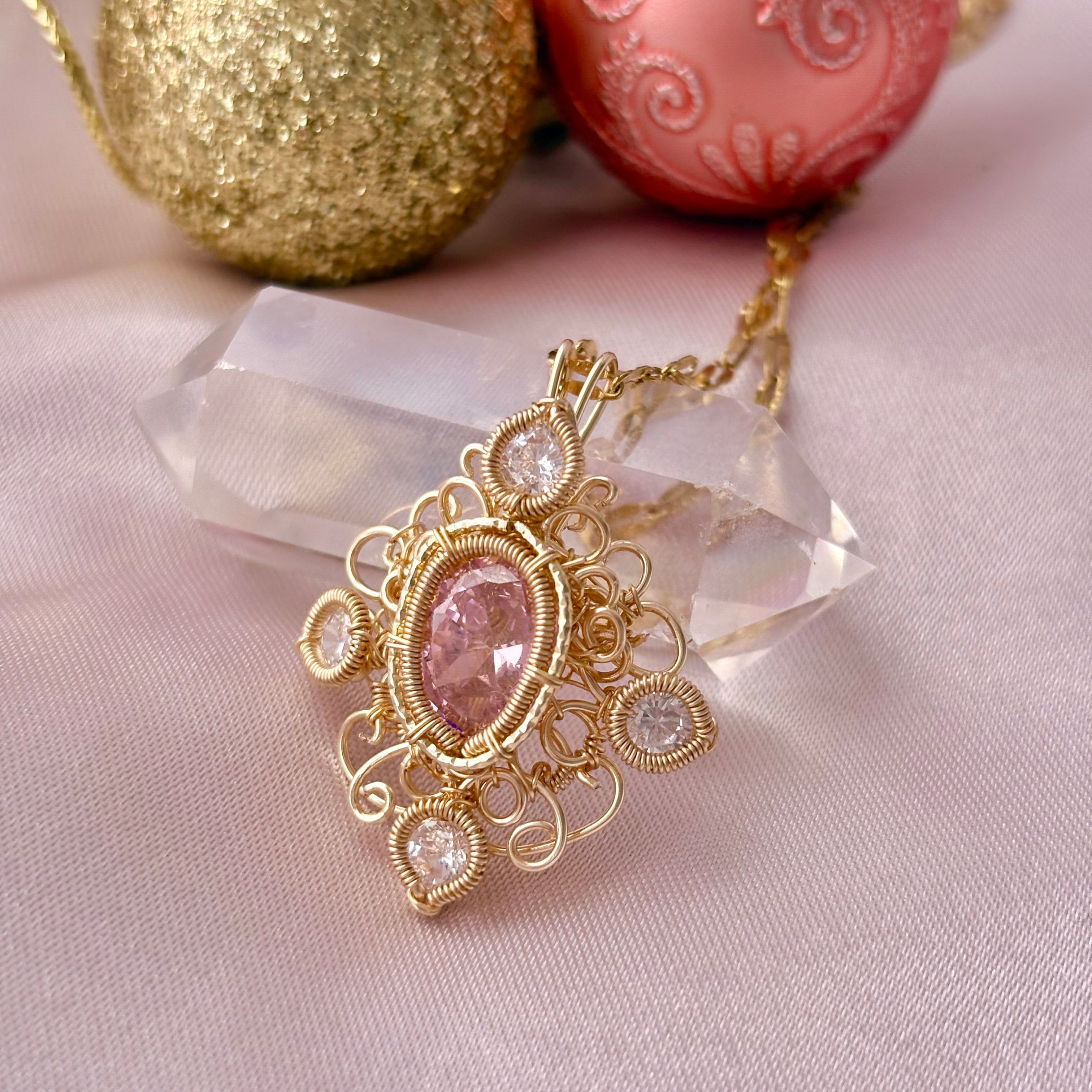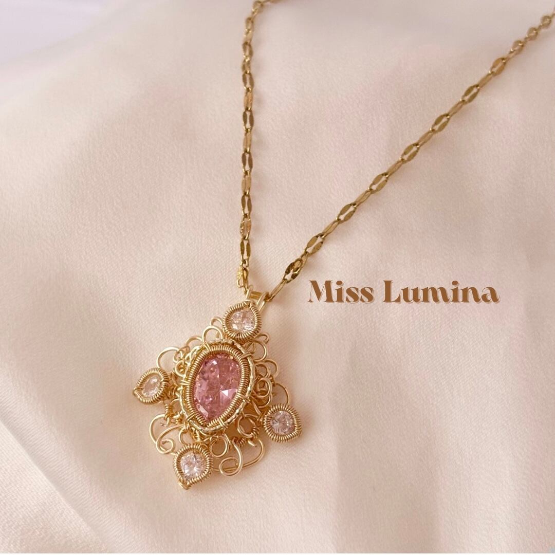 素材:ピンクモアサナイト(合成石)、スワロフスキークリスタル、ワイヤー(ゴールドカラー)