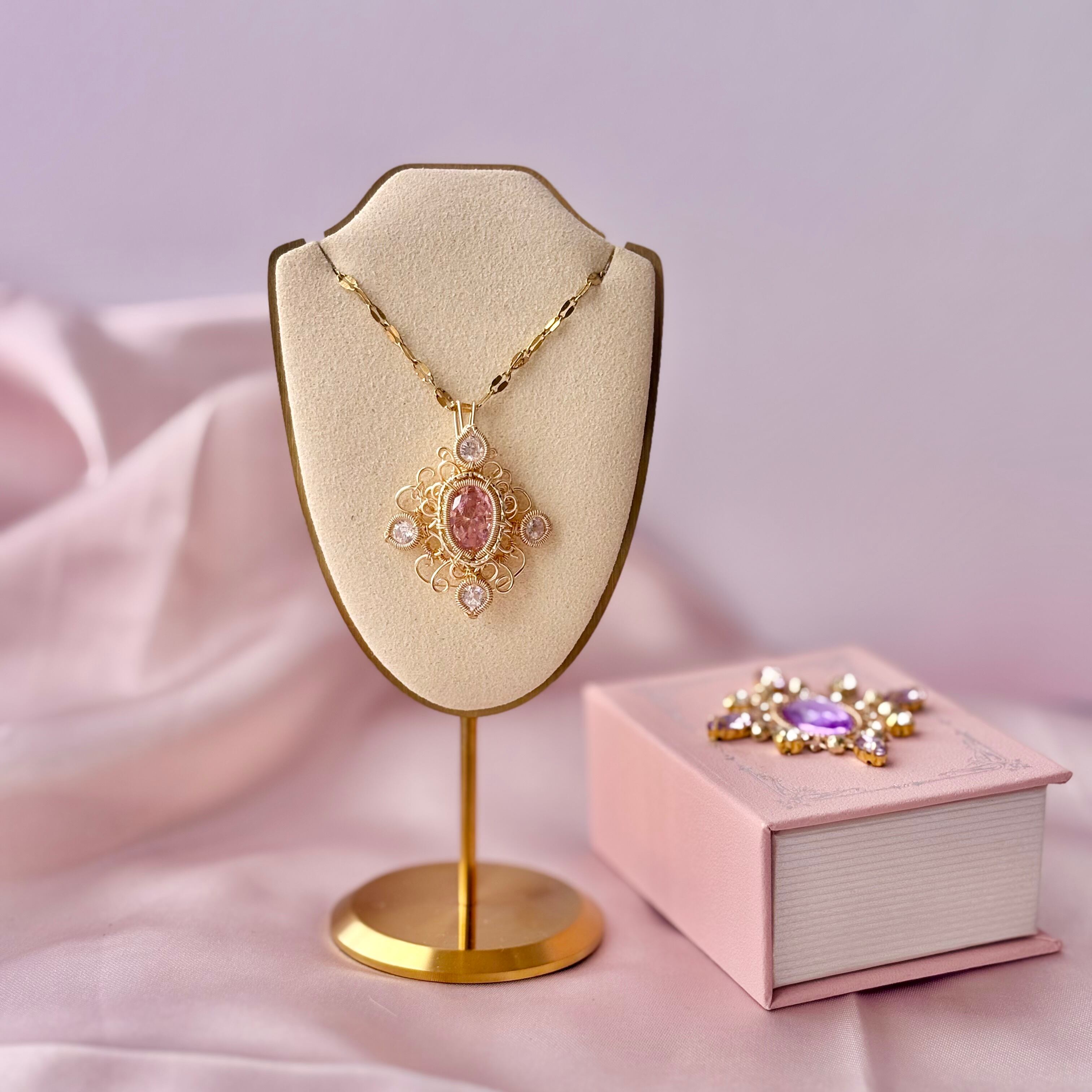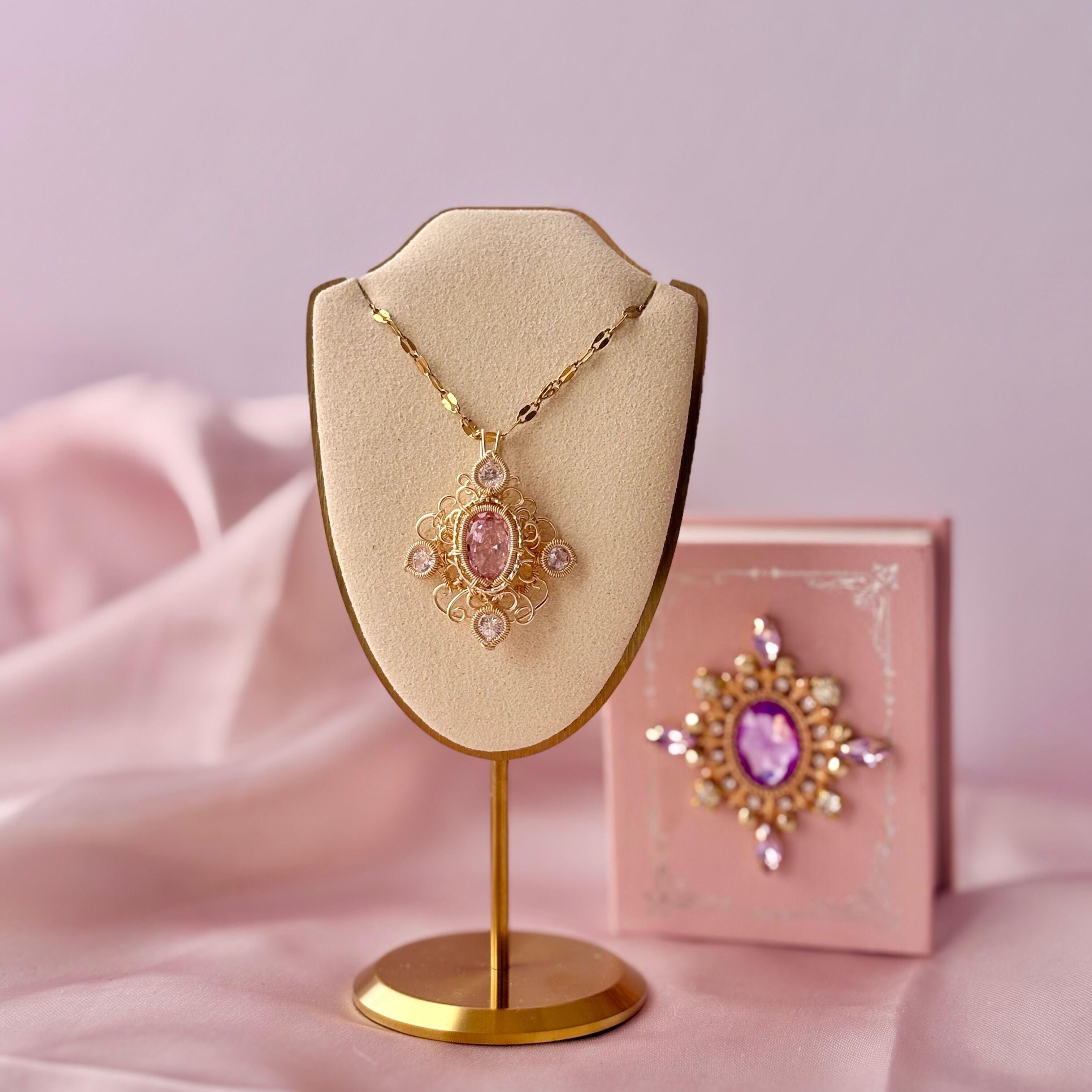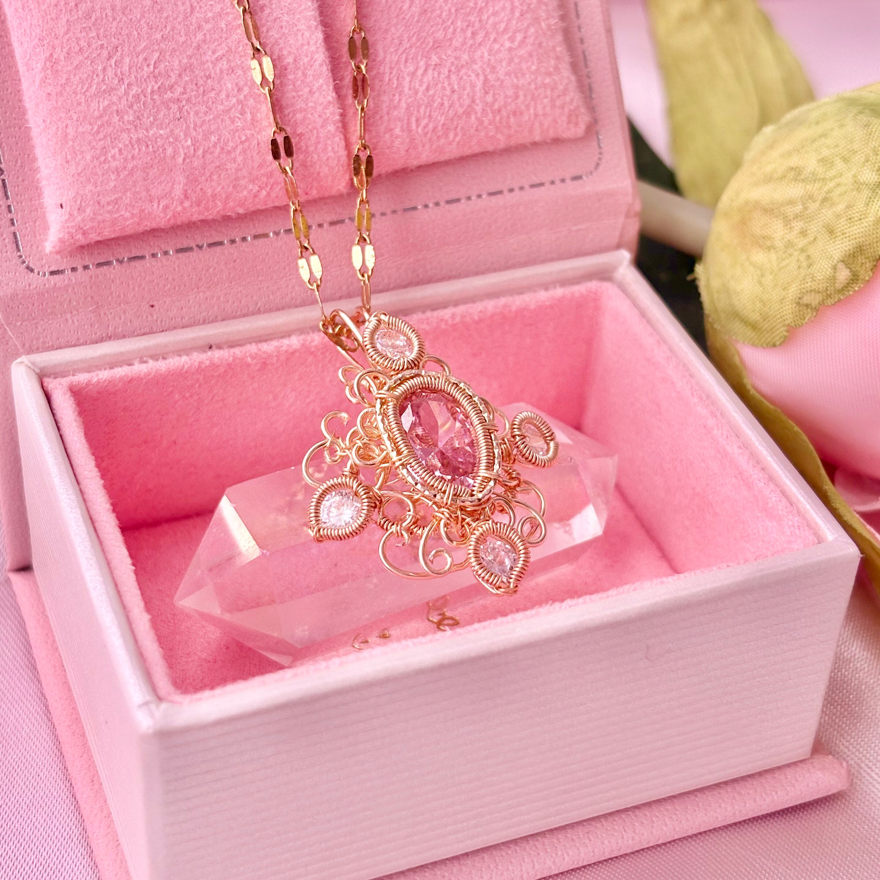 素材:ピンクモアサナイト(合成石)、スワロフスキークリスタル、ワイヤー(ゴールドカラー)