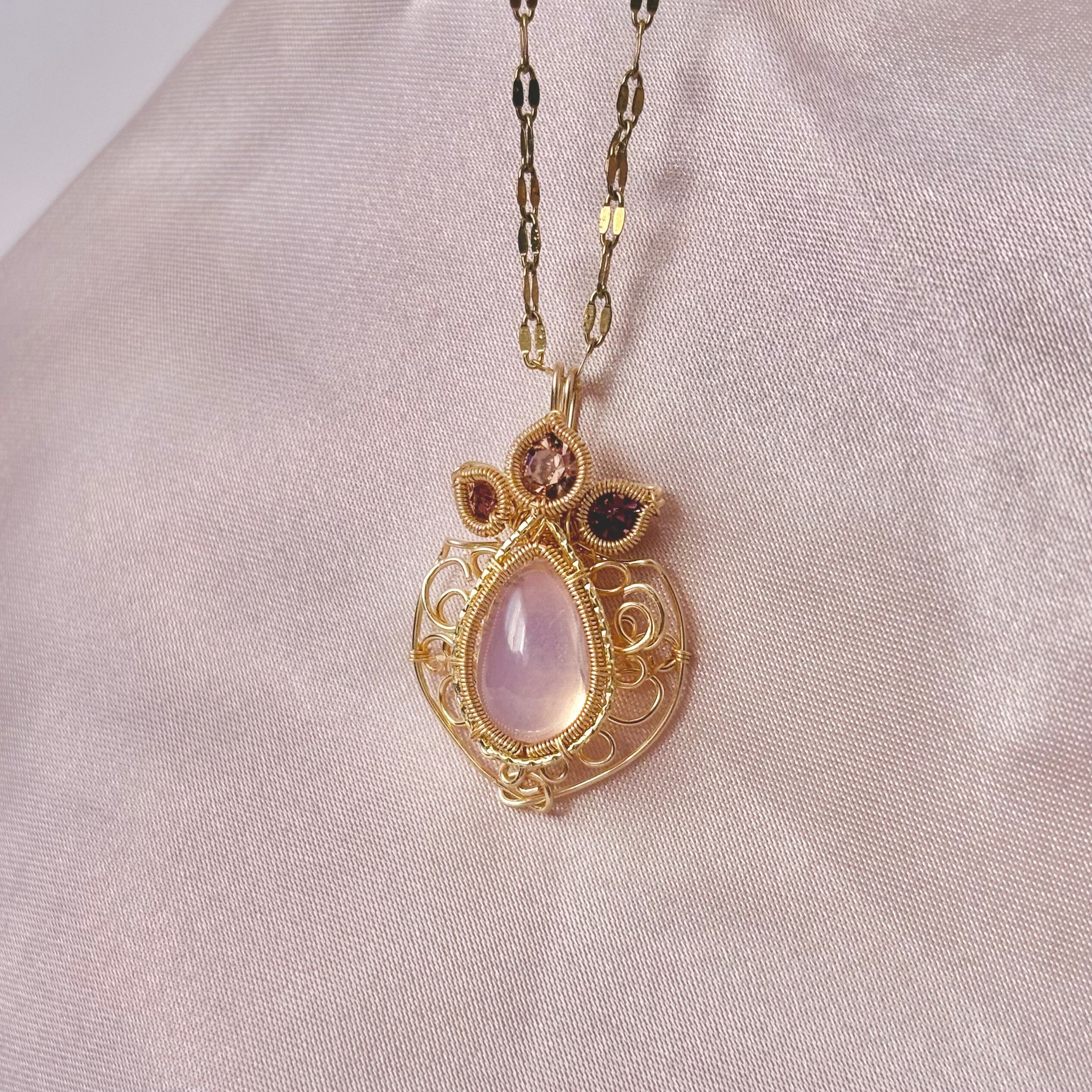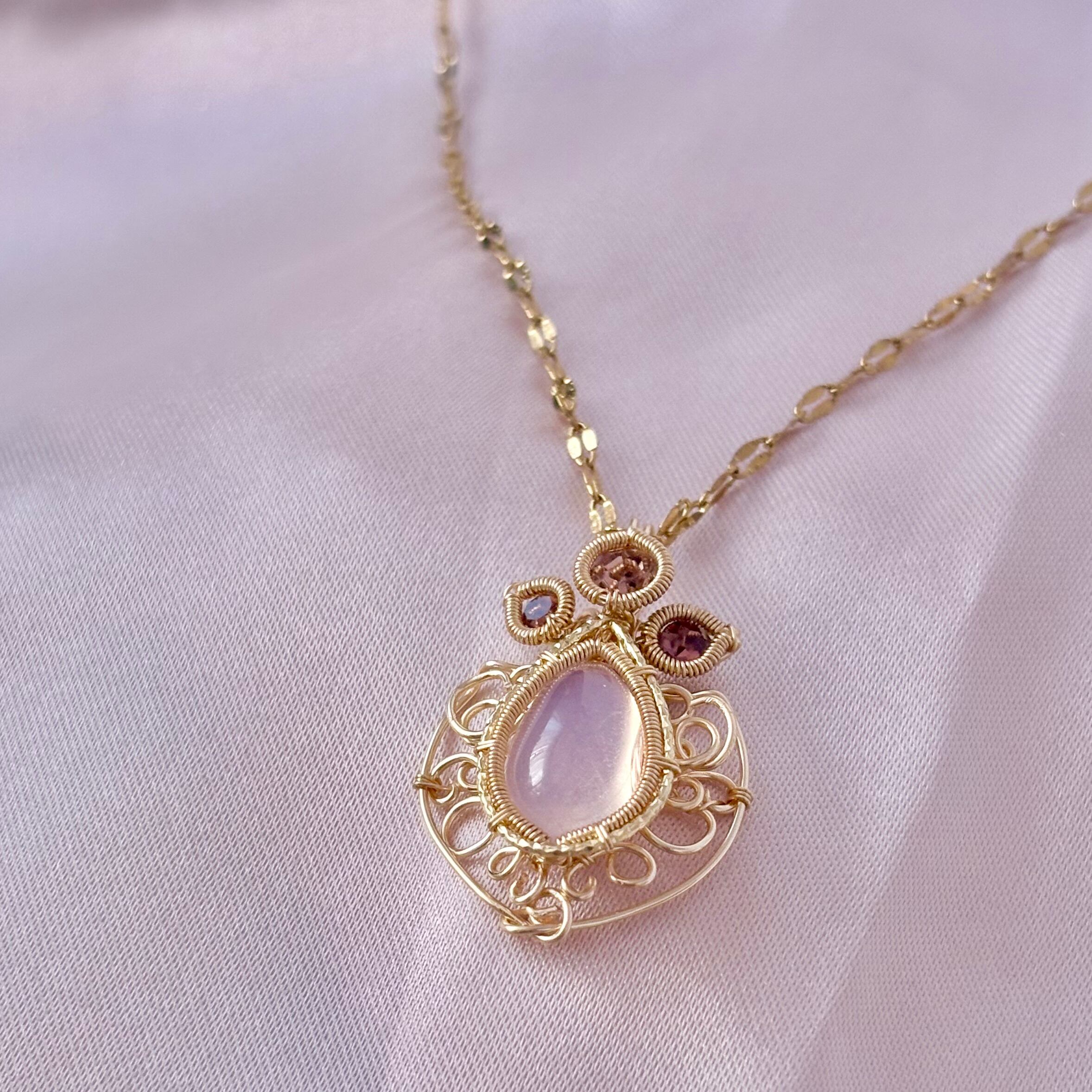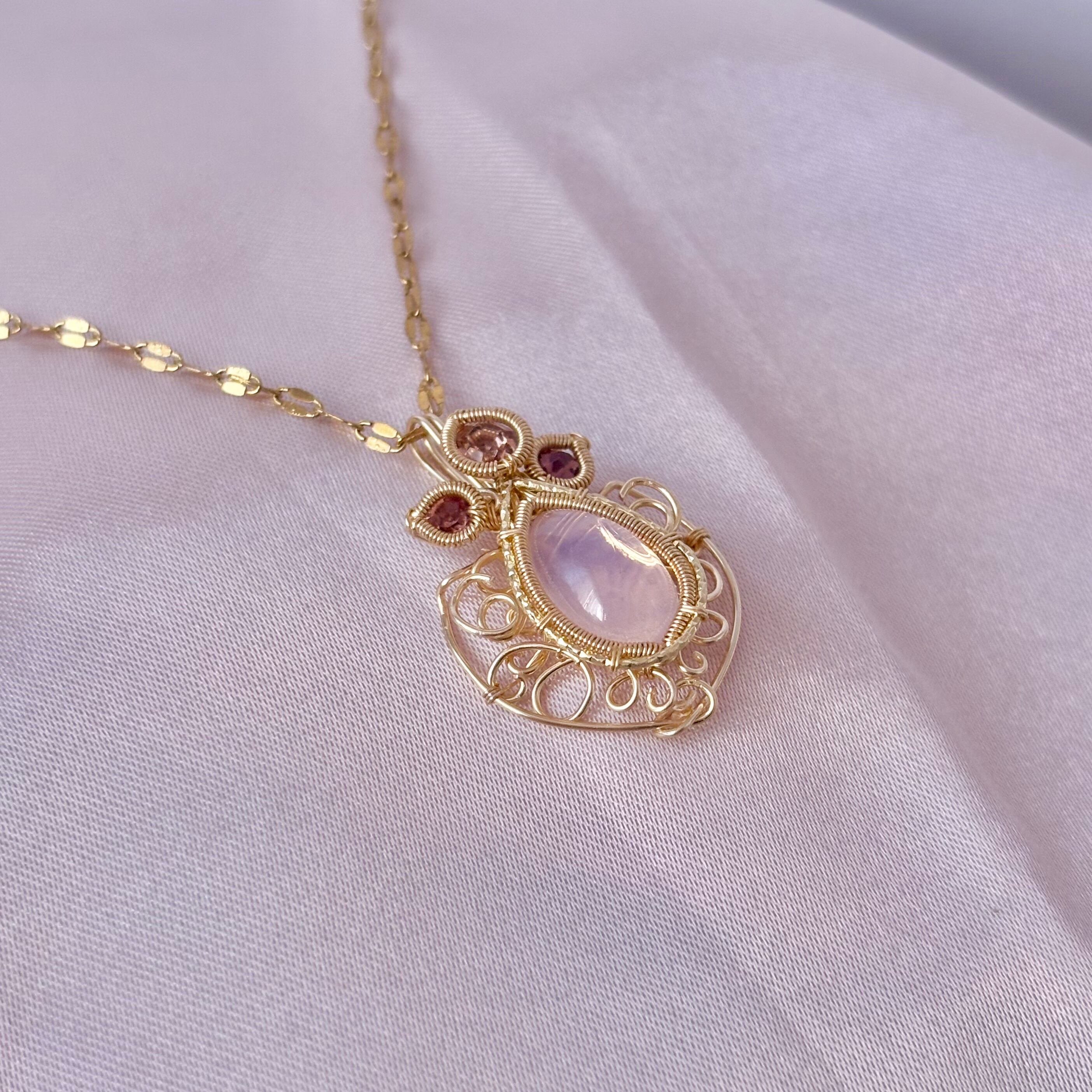 手の中で磨かれ生まれ変わったこの石は、光を受けるたびに淡い紫とピンクを揺らめかせ、まるで優しいピンクの月のように輝いています。
