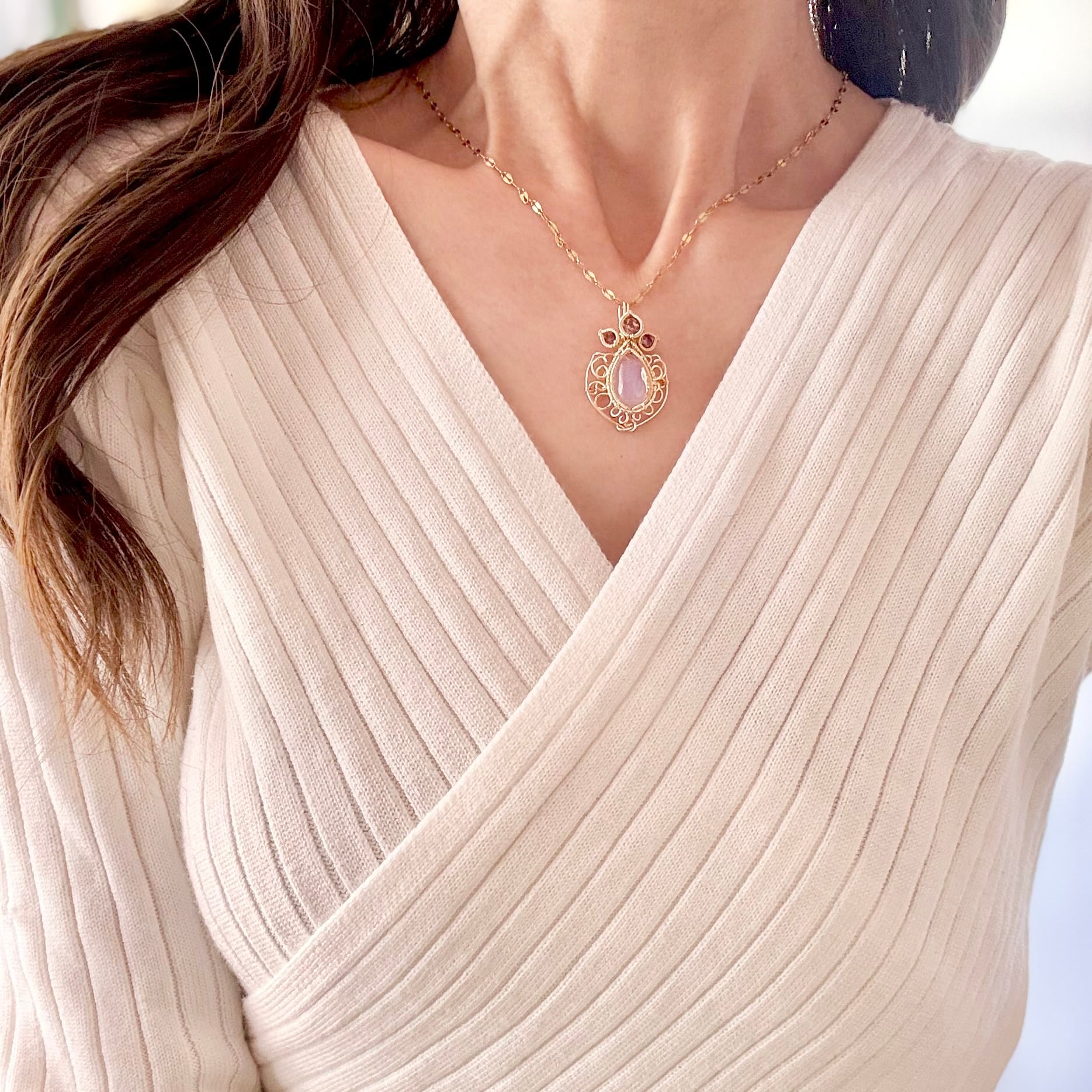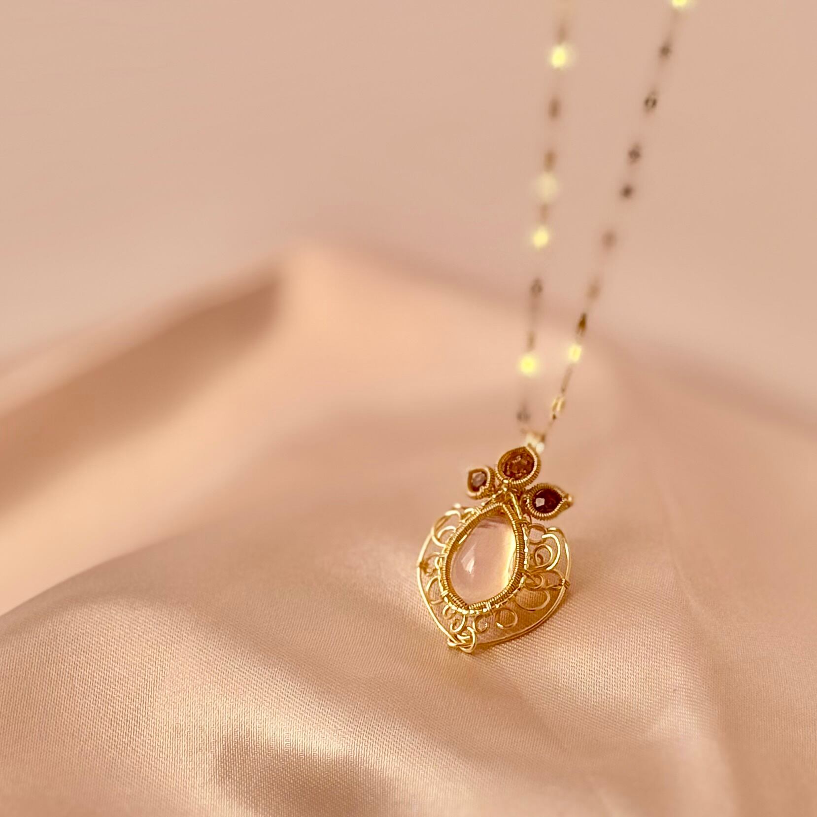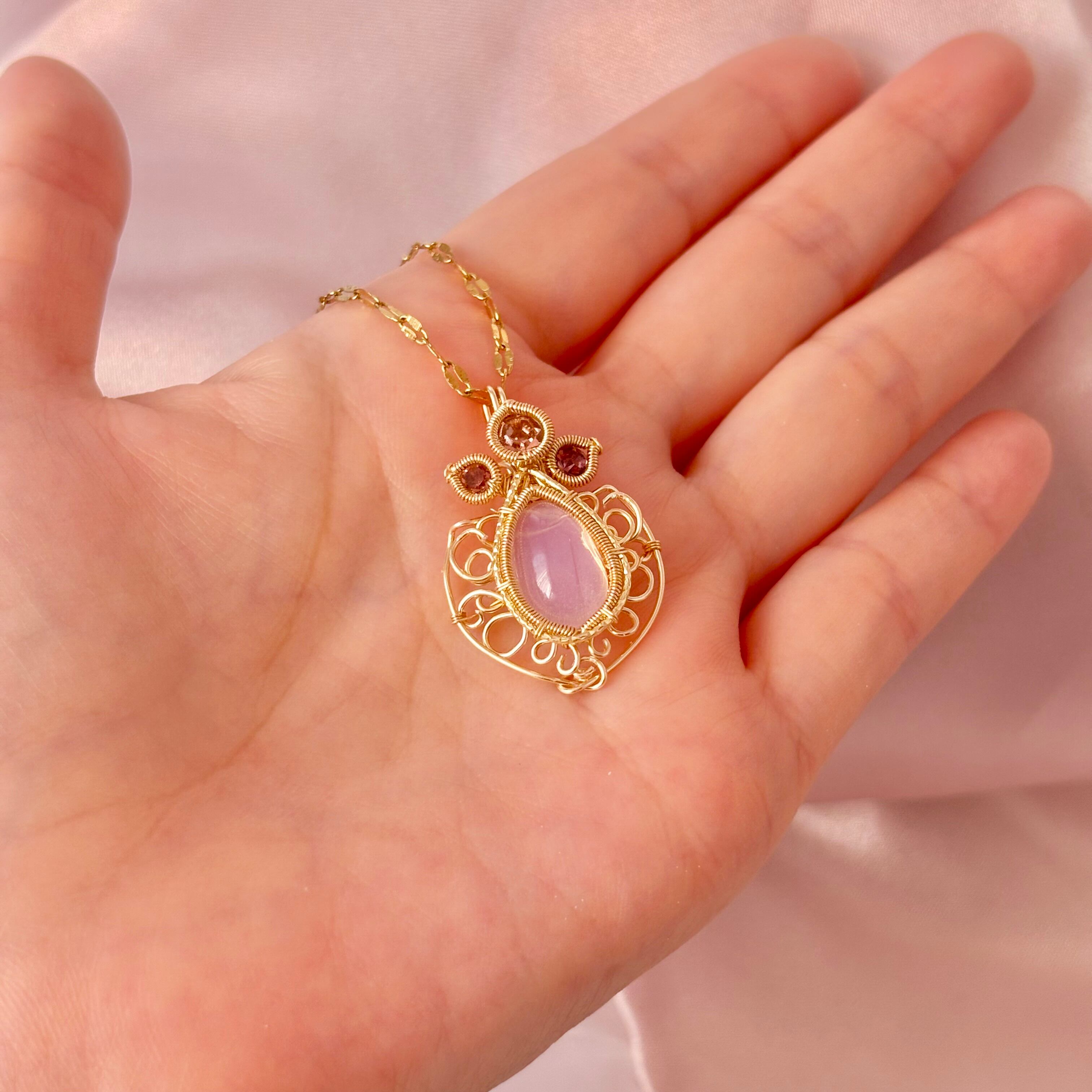 手の中で磨かれ生まれ変わったこの石は、光を受けるたびに淡い紫とピンクを揺らめかせ、まるで優しいピンクの月のように輝いています。
