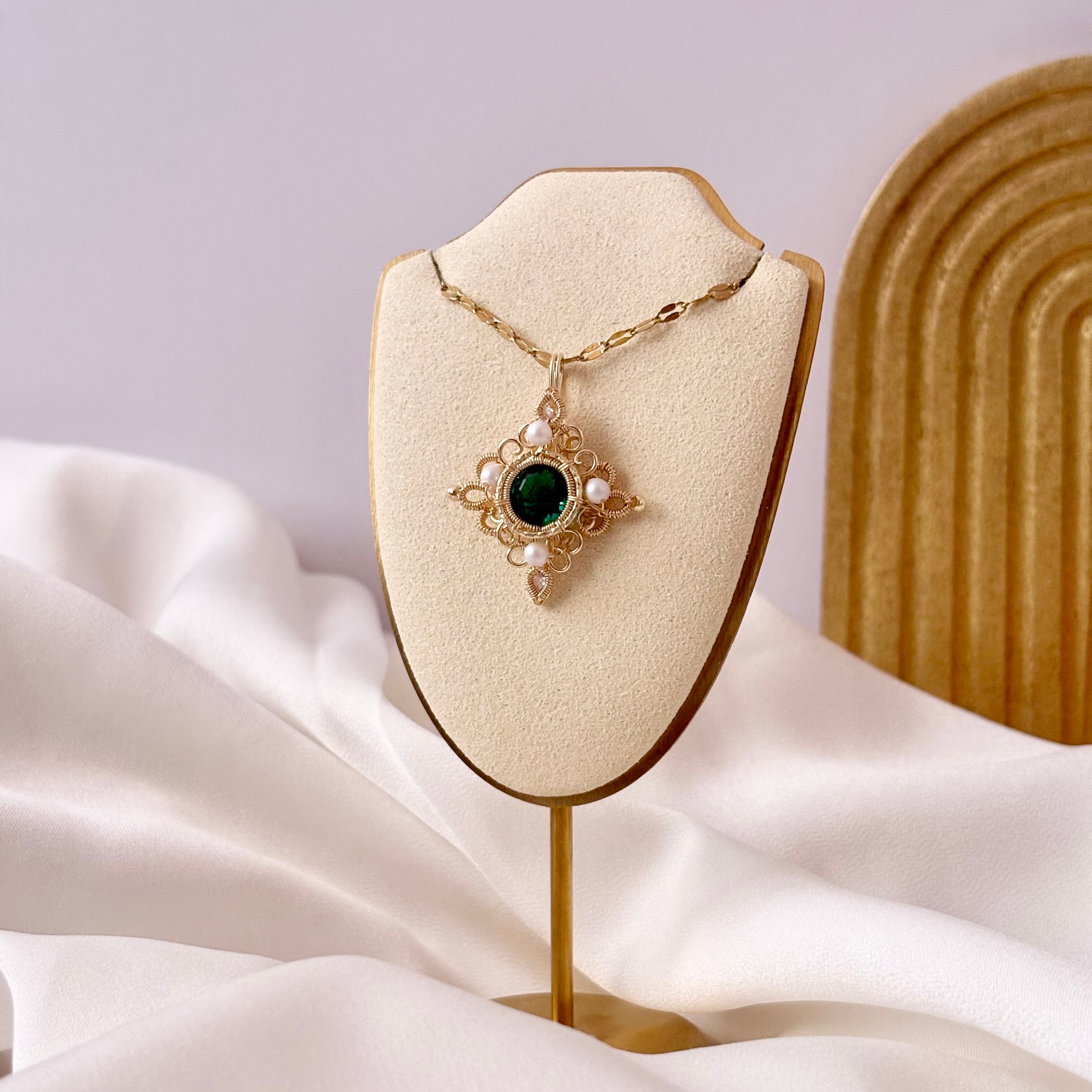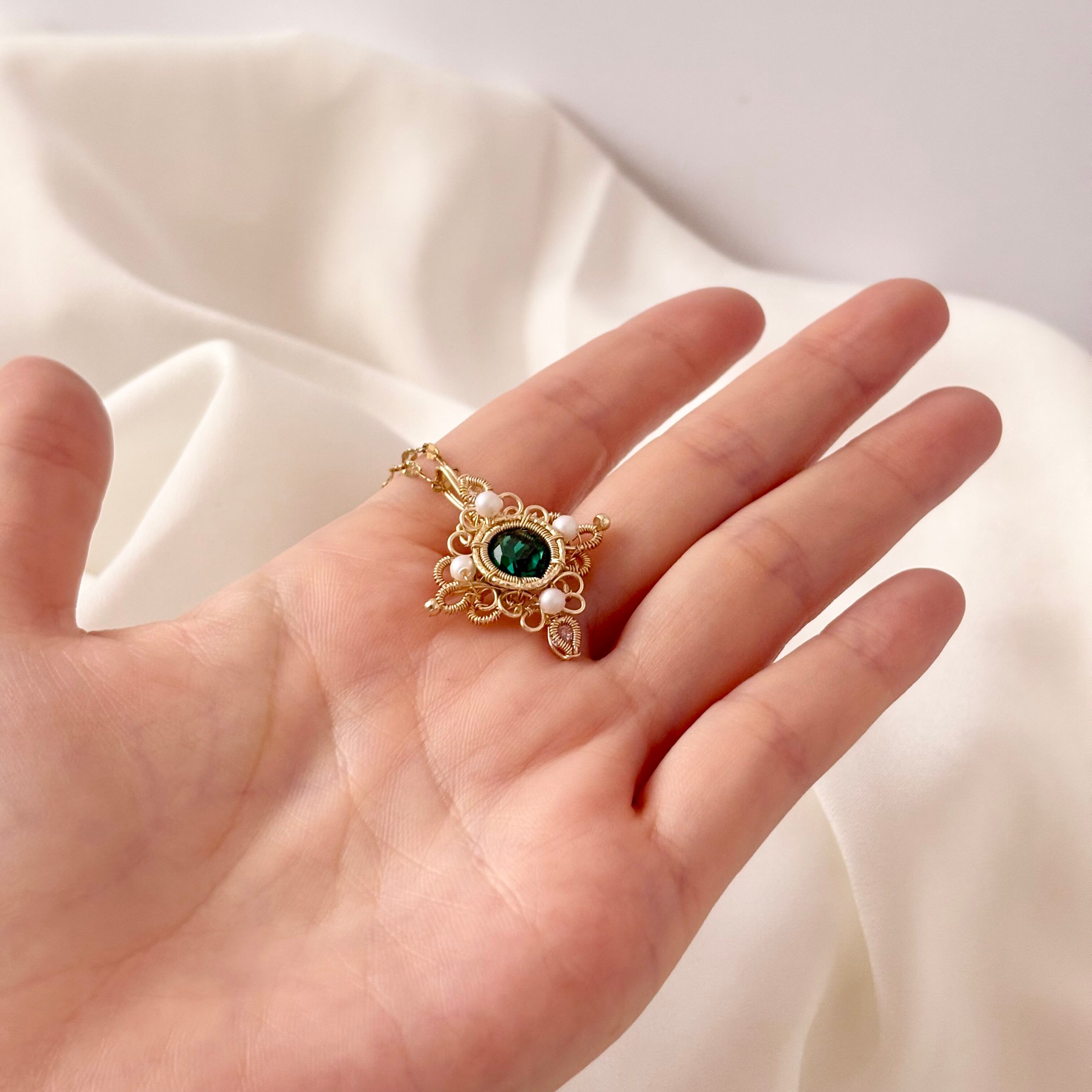 中心のエメラルドを囲むように配置された淡水パールで聖なる守護を表現し、上下にスワロフスキーを置くことで、光の流れをイメージしています。