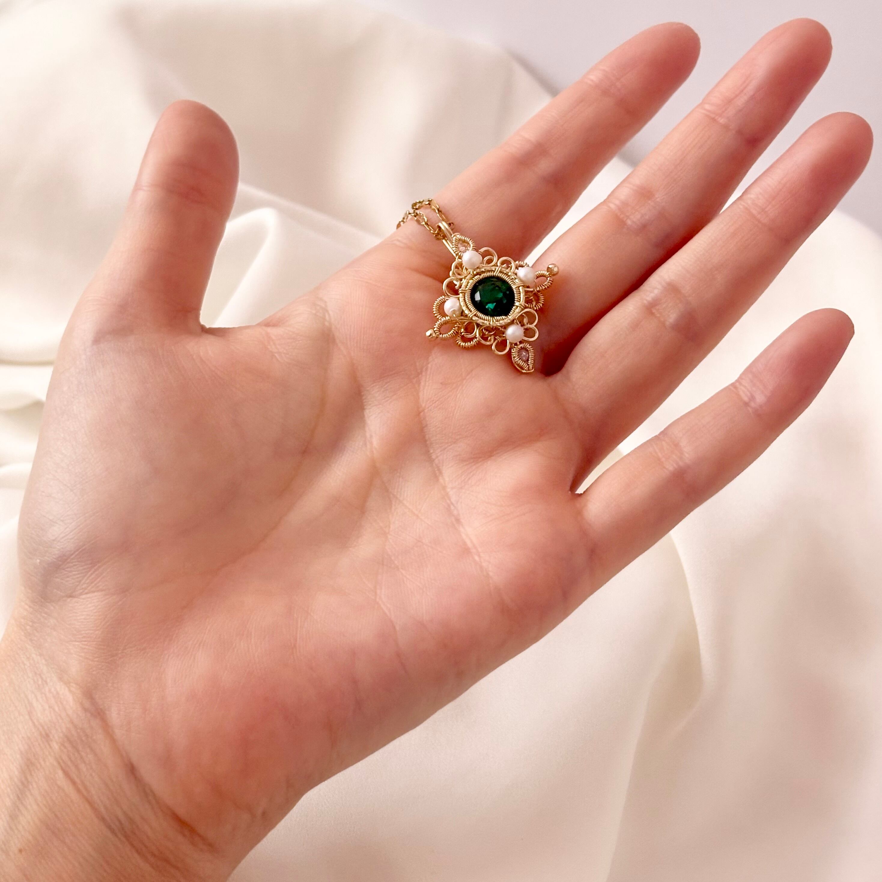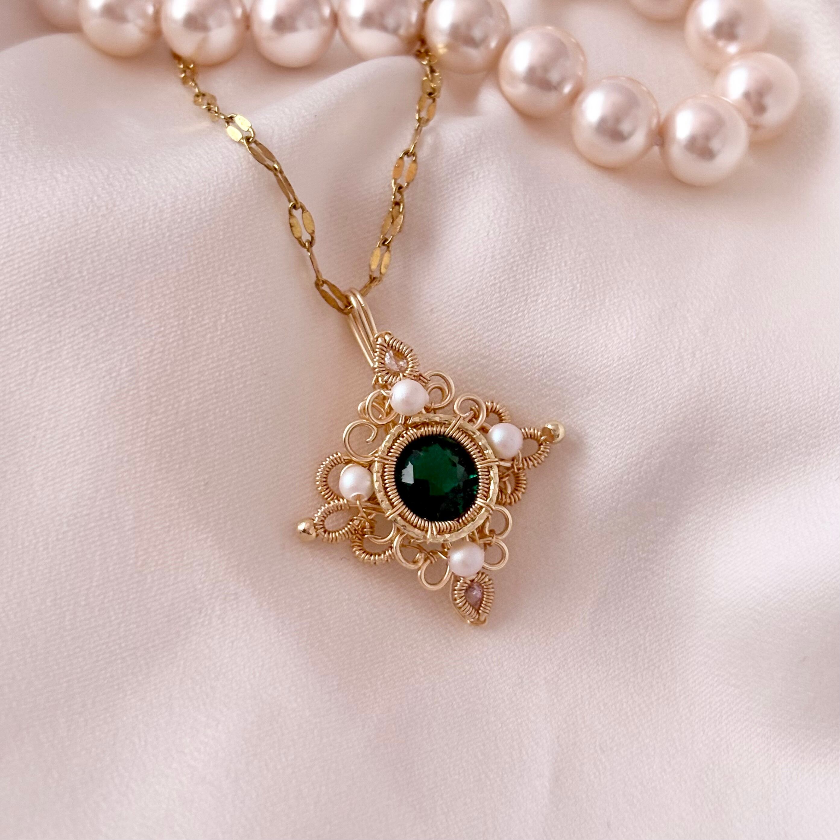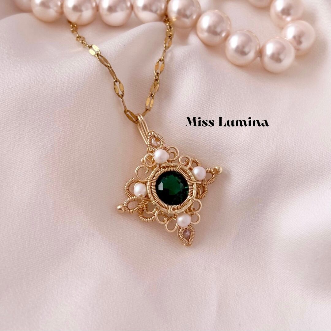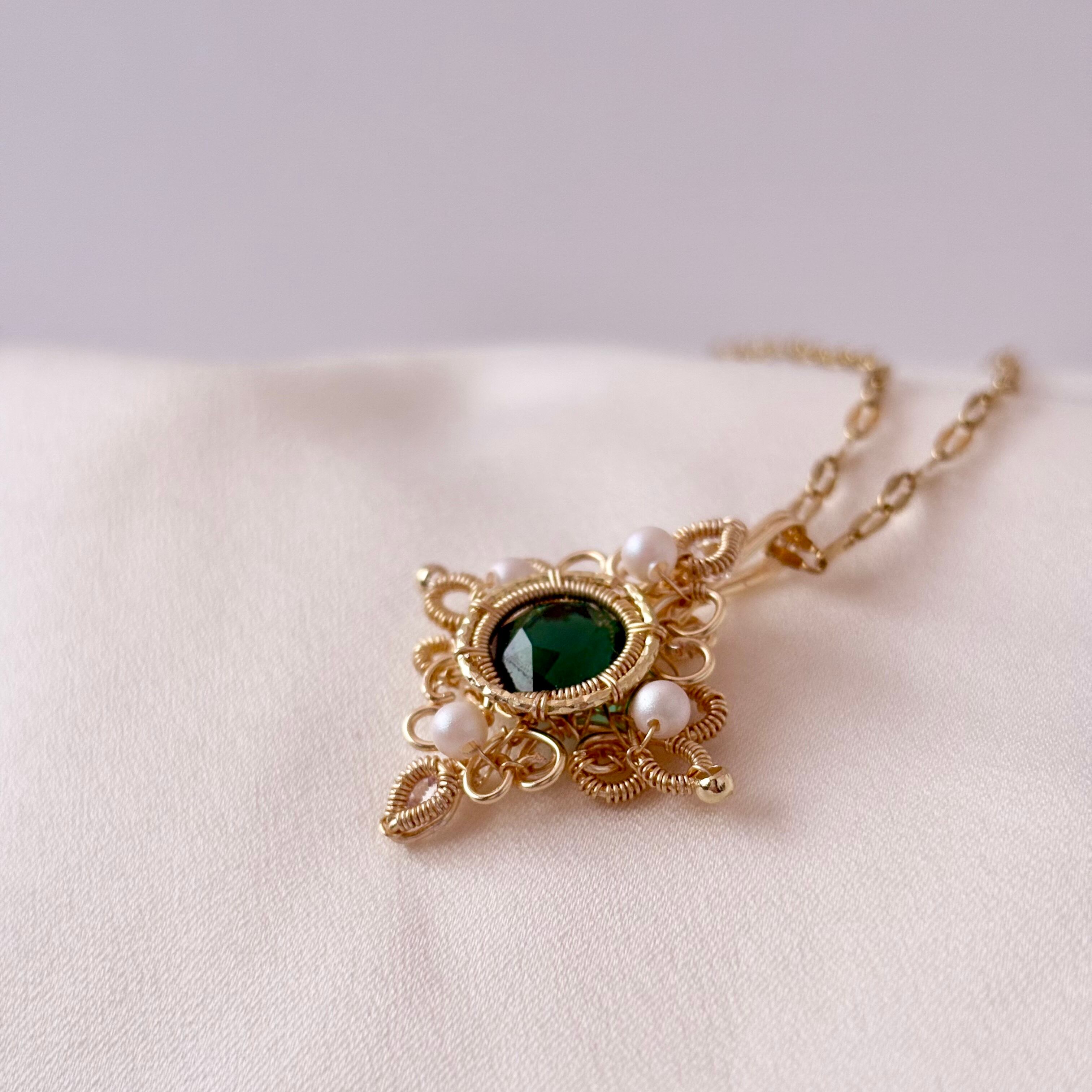 素材:ラボグロウンエメラルド(合成石)、スワロフスキー、淡水パール、ゴールドカラーワイヤー